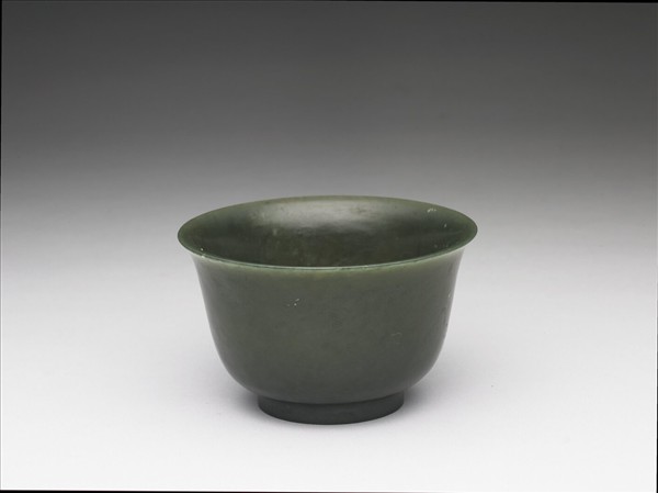 碧玉,色深綠。撇口、深腹、弧壁、圈足。平素無紋。外底心陰刻「大清乾隆年製」六字篆款。
