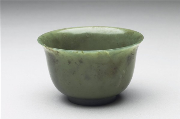 碧玉,色深綠。撇口、深腹、弧壁、圈足。平素無紋。外底心陰刻「大清乾隆年製」六字篆款。