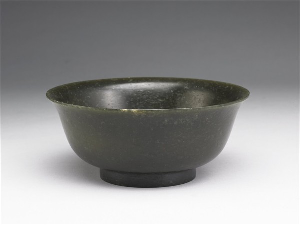 碧玉,色深綠。撇口、弧壁、圈足。平素無紋。外底心陰刻「大清乾隆年製」六字篆款。