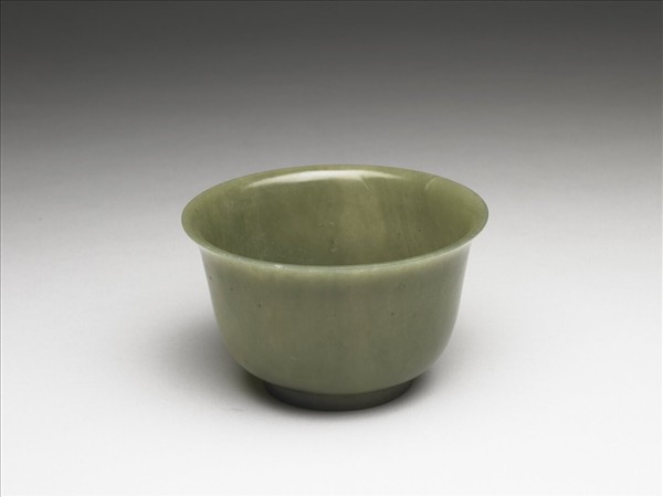 碧玉,色黃綠。撇口、深腹、弧壁、圈足。平素無紋。外底心陰刻「大清乾隆年製」六字篆款。