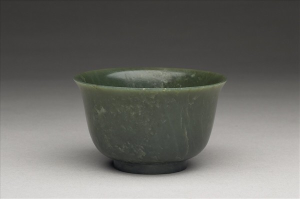 碧玉,色深綠,雜灰白斑。撇口、深腹、弧壁、圈足。平素無紋。外底心陰刻「大清乾隆年製」六字篆款。