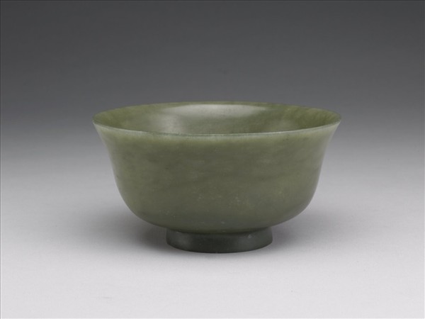 碧玉,色碧綠。撇口、弧壁、圈足。平素無紋。外底心陰刻「嘉慶年製」二行四字隸款,附黃籤。