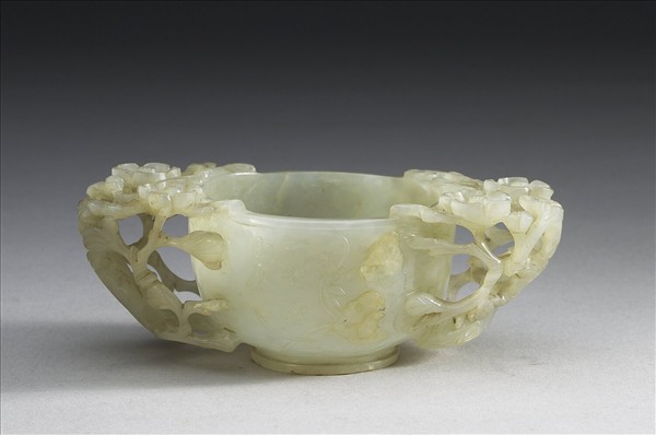 玉質,色青白。圓口、直壁、圈足,耳以鏤空梅花為形。外壁淺浮雕花卉、湖石。壁一面琢「一枝飛玉屑」,另一面琢「香氣滿羅浮」。