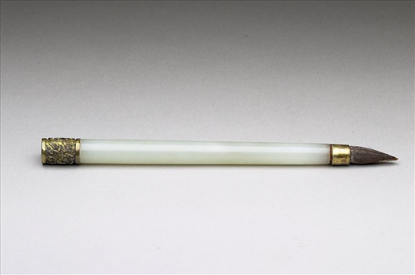 筆以柱狀純淨白玉為管,管端鑲以鏨花鍍金釦飾。