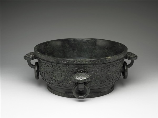 碧玉,不勻的深綠色,琢成深腹圓盆,有高圈足及四個器耳,耳上作版狀如意形,下有活環。口與圈足沿各飾回紋一圈,器腹以雲紋為界,琢滿纏枝番蓮花,造型厚重端莊。