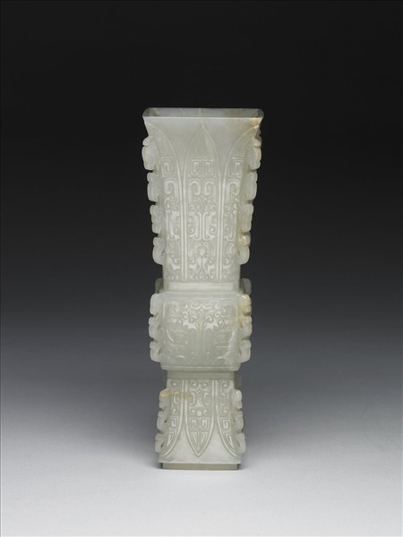 白玉,器身多道璺,雜赭斑。仿古銅方觚之形。脰飾蕉葉紋,內填夔紋,腹飾獸面紋,足飾蕉葉紋,有棱脊。