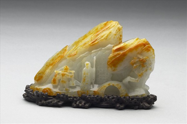 一面琢小舟泊岸,舟子負槳而行;一面琢老者拄杖過橋,童子肩書囊在後。兩面岩壁均陰刻隸書清高宗三十三年(1768)御製詩。