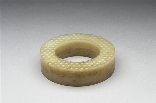 玉質,雜灰斑,上下蓋口微傷。盒形如環,中空,蓋琢乳丁紋。