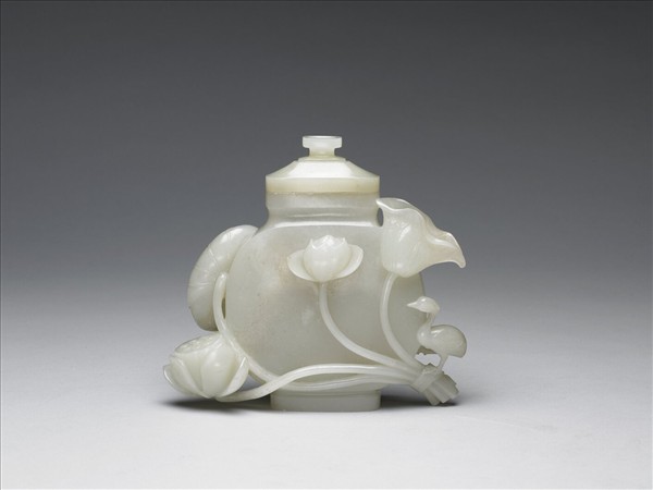 玉質。瓶似扁壺形,附鈕蓋,腹飾浮雕一束蓮花、蓮蓬,一鳧單腳著於花束上。