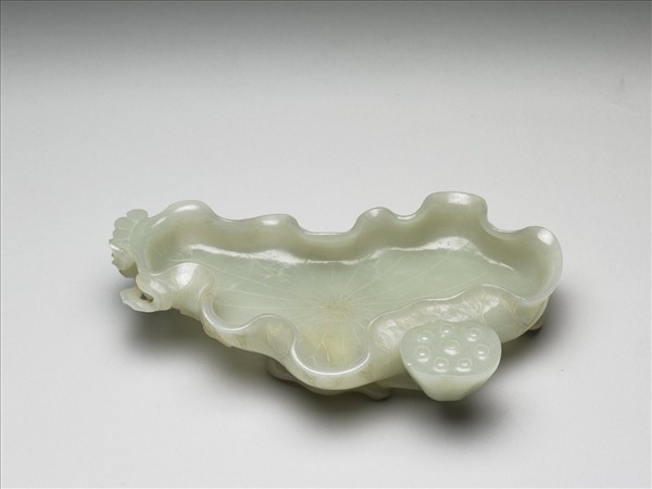 玉質。全器作荷葉形,內卷為器腹,外飾浮雕蓮蓬,以荷葉為底,旁有三尾小魚。