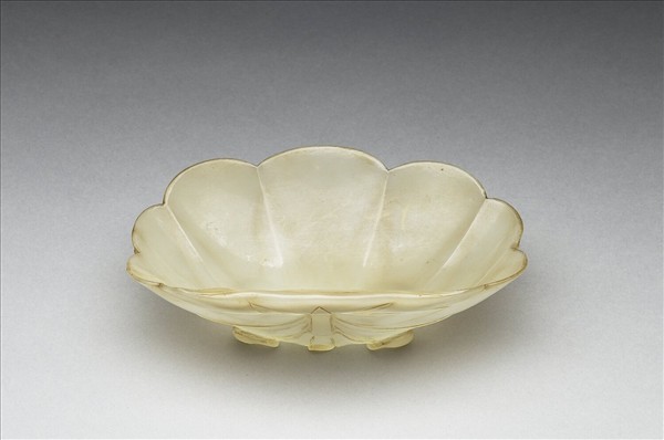 青玉,琢一外形似蚌殼的水盛。器底雕一花朵,十片長葉正好分布於十條凹槽上。盤內壁也雕一花卉。