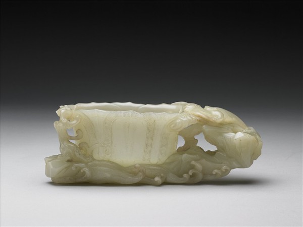 玉質。器口作花式,外琢雷紋,器腹外飾浮雕琱蝙蝠、靈芝、蟠螭,底琢波濤紋。
