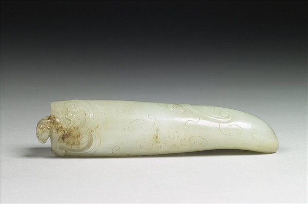 白玉。器似觿,中空為筒形。器身飾雲紋,近口處有一浮雕鳥首異獸,長尾穿入雲端。黃籤「春字一千八百七十五號」、秀字「七三八百號」(蘇州碼)。