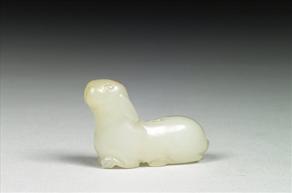 白玉。全器立雕臥兔,昂首伏臥,背至腹有方銎。