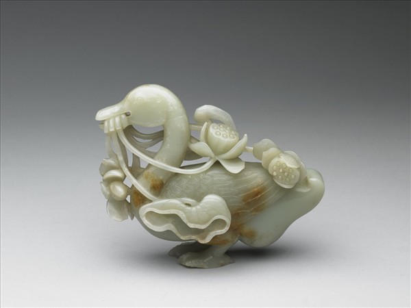 白玉,有璺。全器立雕鴛鴦,長頸立姿,口銜蓮枝,局部細節如足蹼,雕琢細膩。