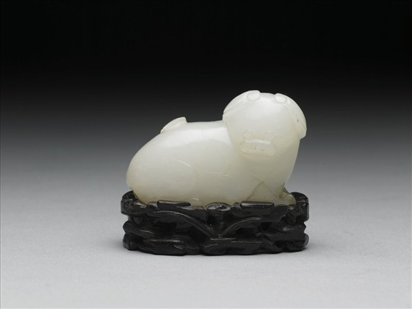 白玉質,琢一犬坐臥回首狀,線條簡單,形體圓潤。帶鏤空雕花木座一只。