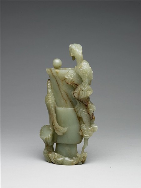 玉質,有赭斑。全器作瓶形,瓶置於波濤雲石上。器側出一對龍鳳,盤踞於雲石間,龍首昂揚,高過瓶口,鳳立於腹側,尖喙,羽翼豐滿。口緣另側有一圓珠。