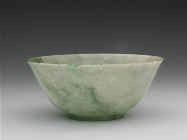 翠玉,玉色淺綠,有深綠色斑。侈口、深腹、淺圈足。