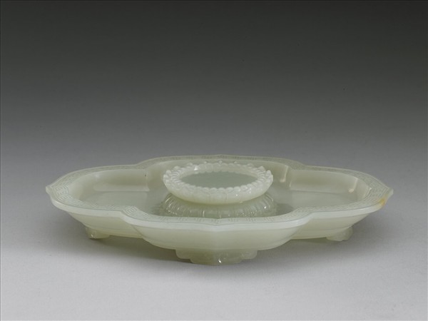玉質。碟作海棠花形,盤心高起圓槽,作花瓣形,用以承杯,盤口、淺腹、平底、四足。口緣飾回紋一圈。與白玉杯成套。玉杯參見故玉000753。