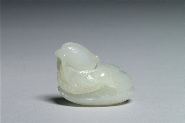 玉質。立雕鴛鴦一隻,口銜荷花,躲浮於一層蓮葉上,附木座。