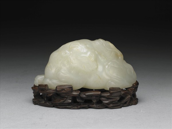 白玉質,琢一獅坐臥回首狀,線條細膩,眼神炯炯,鬃毛細緻清晰,形體圓潤。帶鏤空雕花木座一只。