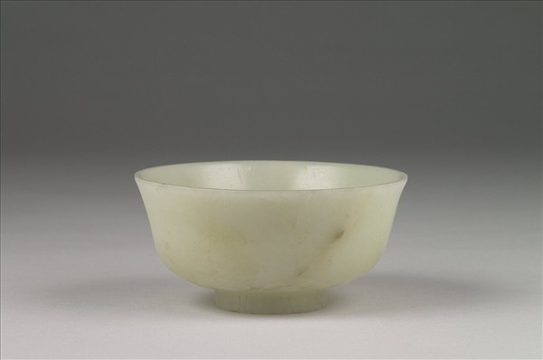玉質,有局部灰斑。碗口稍外撇,弧形壁、有圈足。圈足作八瓣花形,花瓣延伸至碗腹下方。在底部花瓣上刻有「嘉慶年製」四字隸款。