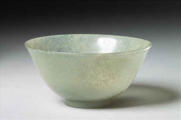 翠玉,有清楚的白綹及局部灰斑。碗口稍外撇,弧形壁、有圈足。