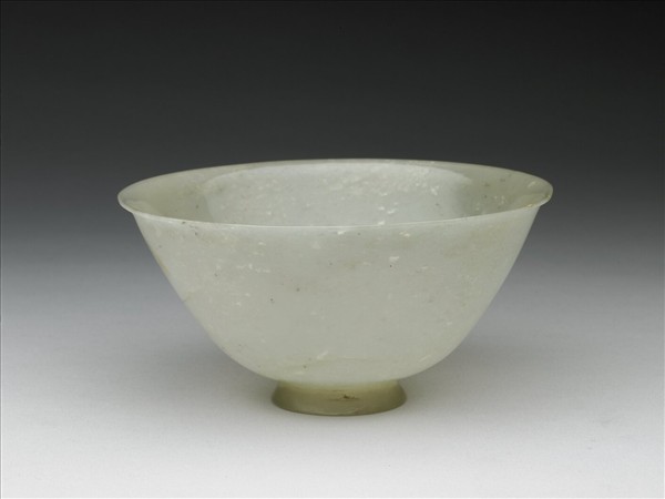 玉質,玉色泛灰,器身有白綹與灰斑,有細璺。撇口、弧形壁、有圈足。器壁極薄。底有「乾隆年製」隸款。