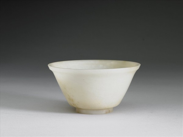 玉質,有局部赭斑。碗壁斜直,靠近圈足處有弧形內收,有圈足。