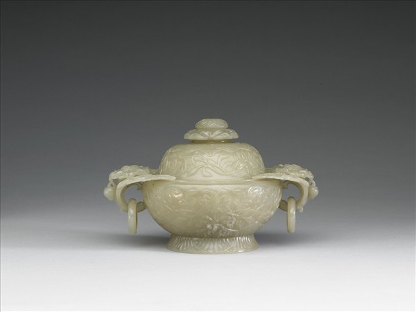 青玉泛灰。圓形爐身的兩側飾以雙葉襯朵花帶環式耳,這是一種融合痕都斯坦玉器風格的裝飾手法。爐身的外壁則淺浮雕連枝花葉紋,而近足處及圈足上均飾花瓣紋。器蓋以朵花形鈕為中心,外圍花瓣紋及連枝花葉紋。