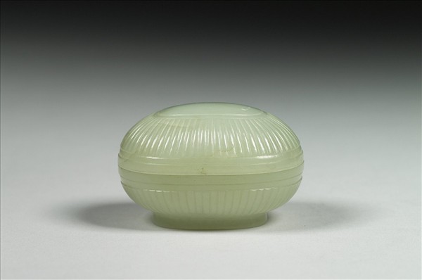 青玉,蓋、盒有璺。橢圓形小盒,蓋與器身幾乎等高,蓋中央以二弦紋圈出橢圓光素的蓋頂,蓋周圍及器身周圍均飾以直棱紋。