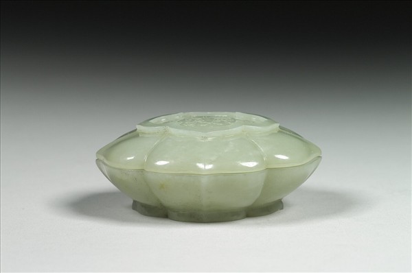 青玉,全器作四瓣花式,蓋、器同形,蓋略扁,子母口、淺腹、花式圈足。蓋頂陰刻番蓮紋。