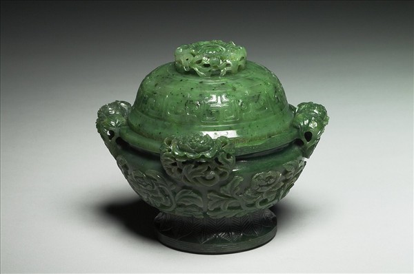 碧玉,口沿微傷缺,足有長傷璺。仿簋形,盤口、縮頸、四耳、圈足,附鈕蓋。蓋鈕飾鏤空花苞,蓋面飾淺浮雕幾何紋,口飾陰刻弦紋,腹、耳均飾高浮雕連枝牡丹紋,足飾陰刻蕉葉紋、回紋。