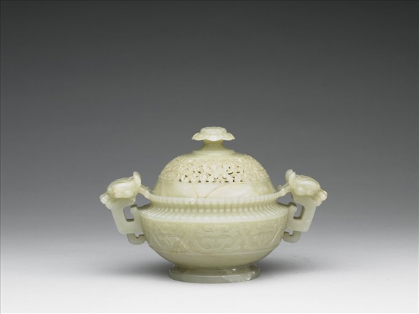 青玉簋式爐,器身及蓋有璺。侈口、縮頸、斜肩、龍首耳、圈足,附蓋。蓋鈕為立雕花苞,蓋面飾鏤空番蓮紋,口飾直棱紋,腹飾幾何紋。