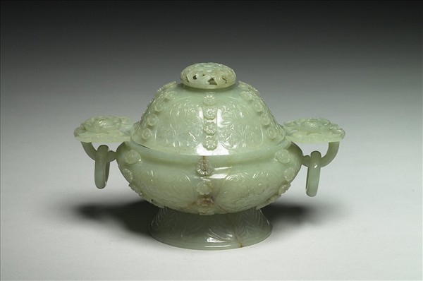 青玉,器身及蓋有璺。仿簋形,子母口、縮頸、環耳、高圈足,附鈕蓋。鈕、耳均飾鏤空花苞,蓋、腹均以開光飾番蓮紋,間飾數組小朵圓花,足飾葉紋。