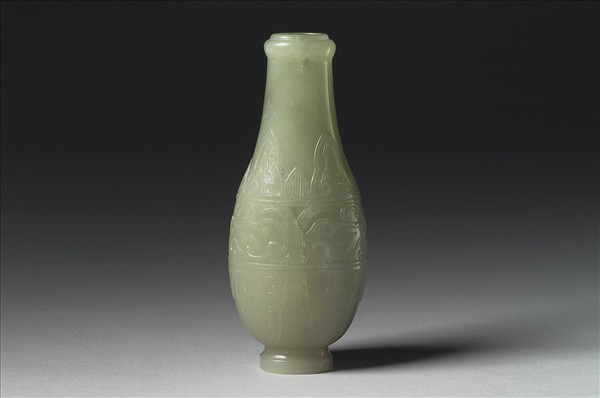 青玉。口緣圓凸、直頸、腹微鼓、圈足。腹以弦紋為界,飾幾何獸面紋,上下各為蕉葉紋。