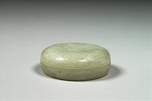 玉質,器身有璺。平頂蓋、子母口、平底。蓋飾陰刻荔枝,外壁飾纏枝花卉。