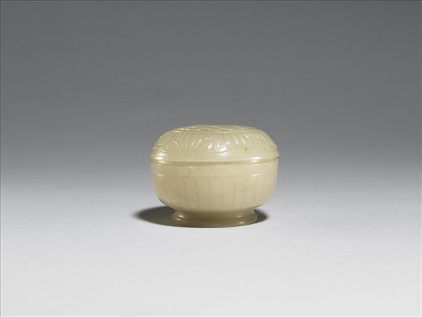 玉質。平頂蓋、子母口、圈足。蓋心飾淺浮雕牡丹,外圍一圈花瓣紋,器壁飾直棱紋。