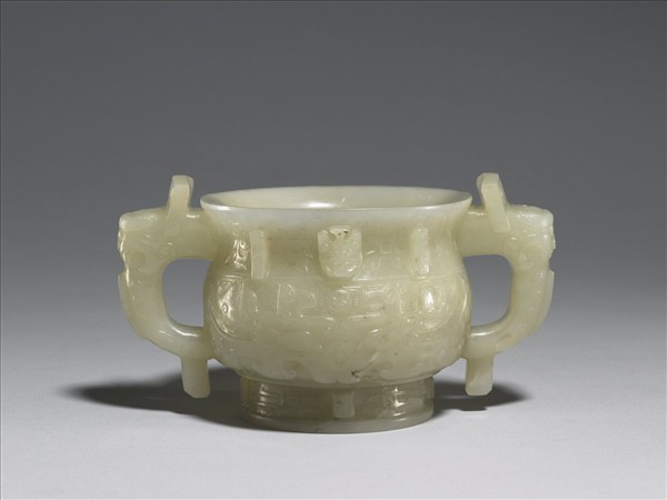玉質,器身有璺。仿簋形,侈口、獸耳附珥、鼓腹、圈足,頸、圈足有棱脊。頸中央有小獸首,間飾「井」字紋,腹飾獸面紋、冏紋,足飾有目竊曲紋。