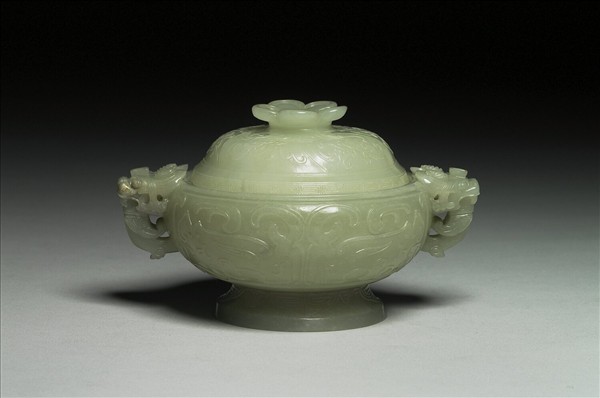 玉質,盒蓋有璺。子母口、龍耳、鼓腹、圈足,附花瓣鈕蓋。蓋飾番蓮紋、雷紋,腹飾獸面紋,足飾蕉葉紋。
