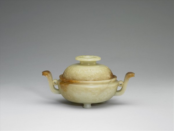 玉質,器及蓋口沿有傷璺。子母口、折肩、朝冠耳、深腹、柱足,附鈕蓋。鈕飾蓮瓣紋,蓋、腹均飾獸面紋,均以雷紋為地。