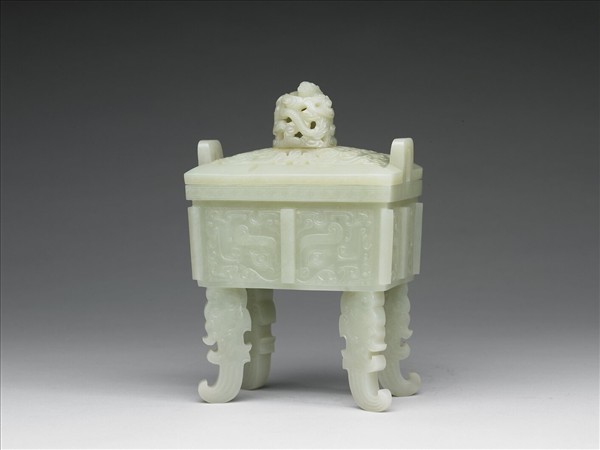 仿商代青銅扁足方鼎的形式:長方形橫切面、折沿、方唇、立耳、四夔龍形扁足。附加玉鏤空蟠龍鈕蓋,此種蓋通常用於焚香之具。器四壁琢獸面紋,回紋填地。器外底刻有銘文:「周公作文王尊彝」七字。