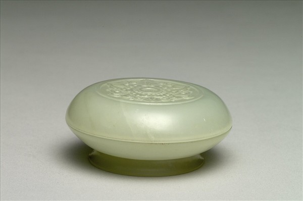 玉質,器蓋有璺。圓扁盒,平頂蓋、子母口、圈足。蓋頂飾一圈弦紋,內飾寶相花紋。
