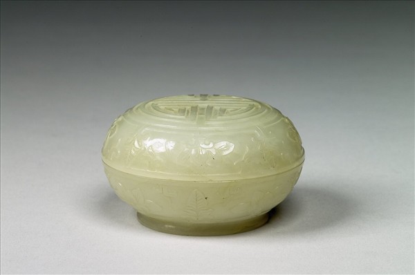 玉質,蓋及盒有璺。圓扁盒,平頂蓋、子母口、圈足。蓋頂飾一圈弦紋,內飾壽字,周圍飾一圈寶相花、葉紋,外壁同飾寶相花、葉紋。