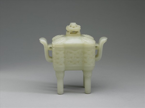 玉質。仿方鼎,附鈕蓋、子母口、朝冠耳、平底、柱足,耳器間有小環。鈕飾立雕盤龍,蓋飾蟠螭紋,腹飾蛇身夔紋,足飾獸面紋。外底陰刻「乾隆年製」四字隸款。