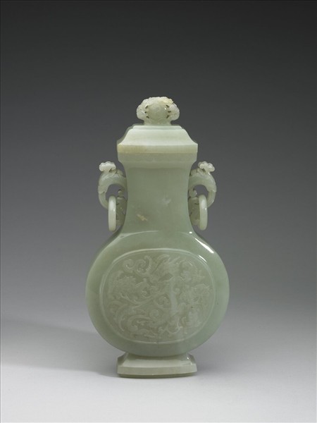 玉質。扁瓶,附鈕蓋、方口微侈、龍首耳、腹圓扁、圈足,耳附活環。鈕飾太極,腹飾穿花龍紋。
