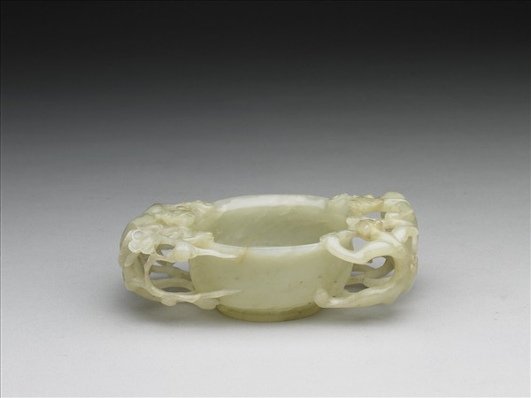 玉質。圓口、深腹、圈足。腹飾立雕三尾螭,螭口啣著口沿,盤踞於梅花松枝上。