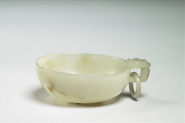 玉質。器口扁圓、淺腹、平底,一側有獸耳,下附活環,附木座。