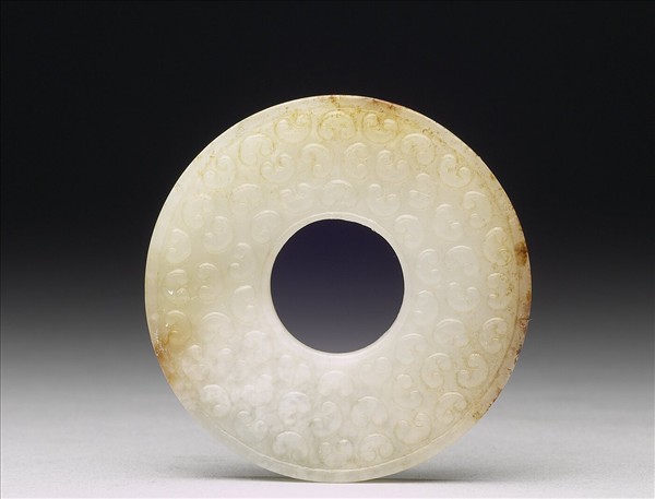 白玉,近外緣局部有褐絲紋,半透明。圓整,有窄廓;兩面飾不同的花紋,一面飾幾何排列勾雲紋,排列整齊;另一面飾雲紋。
