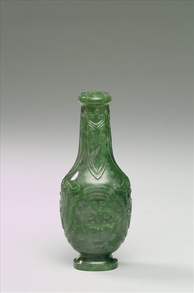 碧玉,有璺。斂口,口緣圓凸、直頸、斜肩、鼓腹、圈足,附木座。頸飾蕉葉紋,腹飾波帶紋,波帶紋上下分層成對夔紋、鳥紋。座分二層,下層飾鏤空幾何紋。